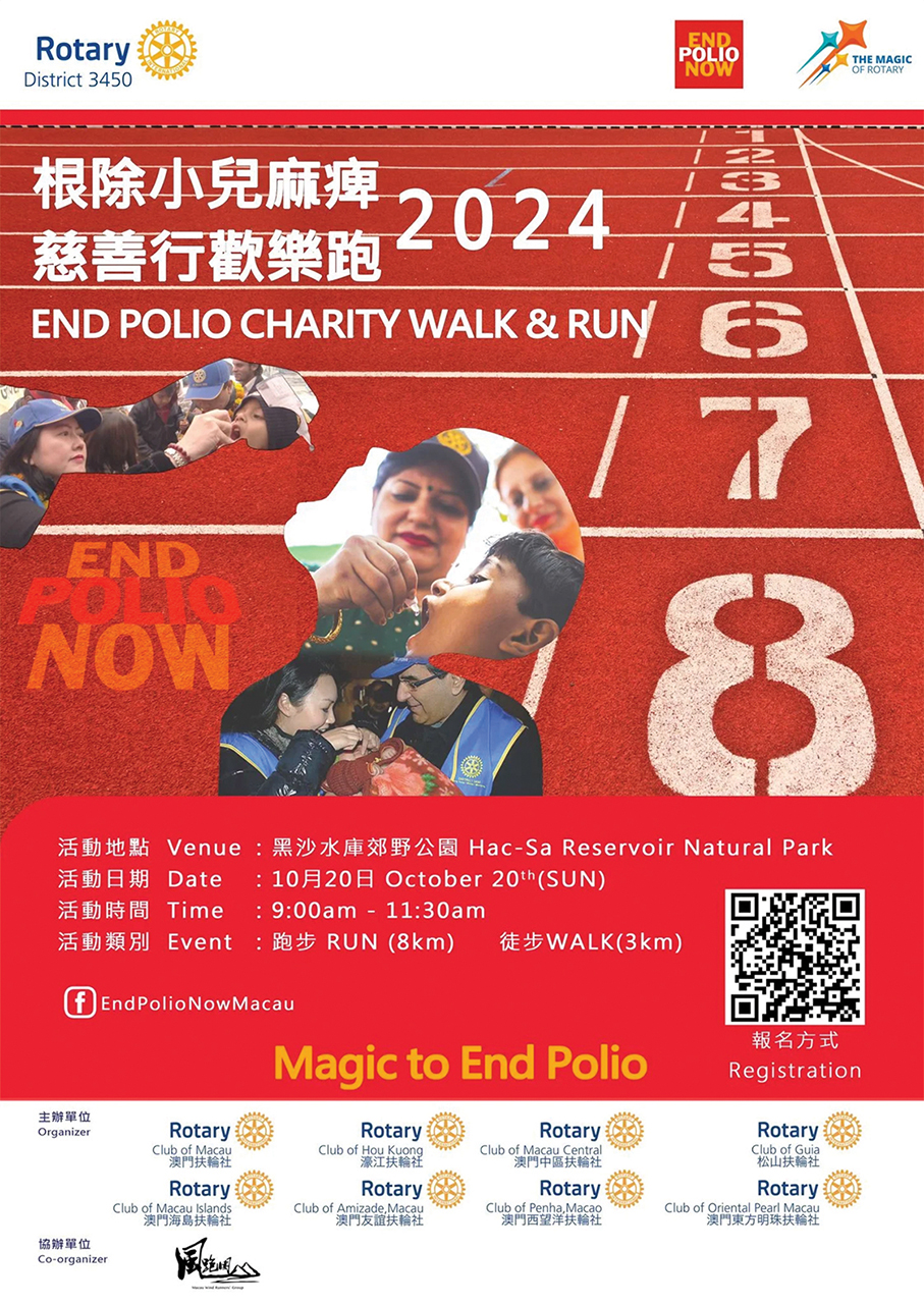 The 2024 End Polio Charity Walk & Run is slated to take place on October 20 in the Hac Sa Reservoir Natural Park in Coloane, aiming to raise funds to support Rotary International’s efforts in eradicating the disease worldwide.