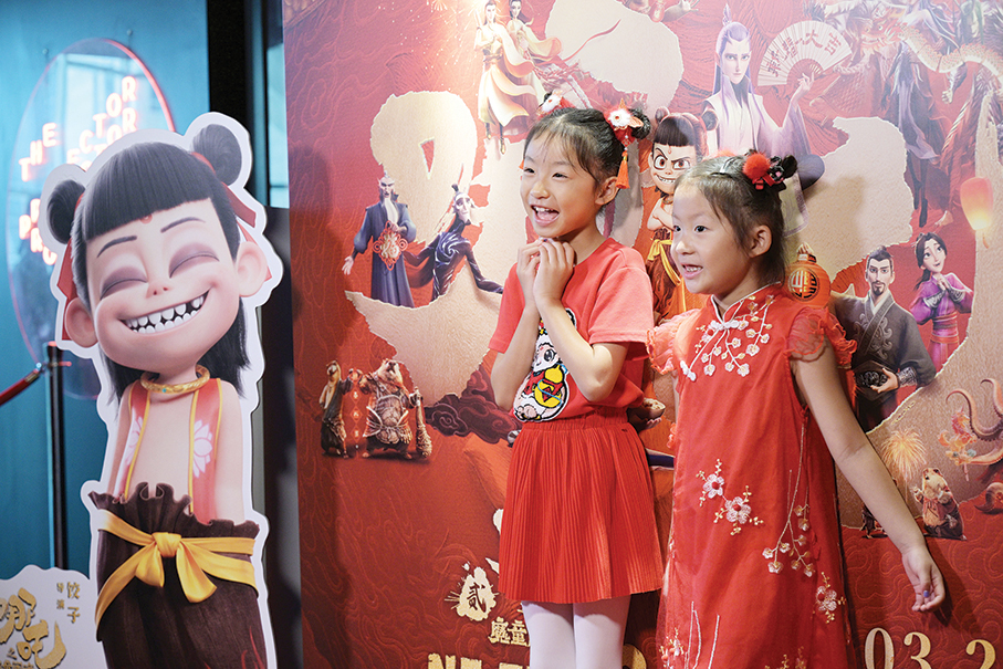 Two girls pose in front of a poster during the local premiere of the Chinese animated fantasy adventure film “Ne Zha 2” at The Projector movie theater in Singapore on Sunday. “Ne Zha 2” will be officially released in Singapore on Thursday. – Xinhua