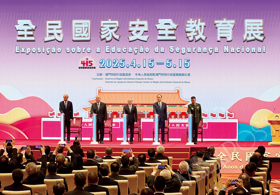 The opening ceremony of the National Security Education Exhibition held yesterday marked the 10th anniversary of the National Security Education Day and the eighth consecutive year of the exhibition. Dignitaries in attendance included Chief Executive Sam Hou Fai, Vice-Chairman of the Chinese People’s Political Consultative Conference (CPPCC) Edmund Ho Hau Wah, Central People’s Government Liaison Office Director Zheng Xincong, Foreign Ministry Commissioner Liu Xianfa, and Chinese People’s Liberation Army (PLA) Macau SAR Garrison Commander Yu Changjiang, along with over 420 officials and representatives from various sectors present at the Forum Macao complex in Nam Van.
