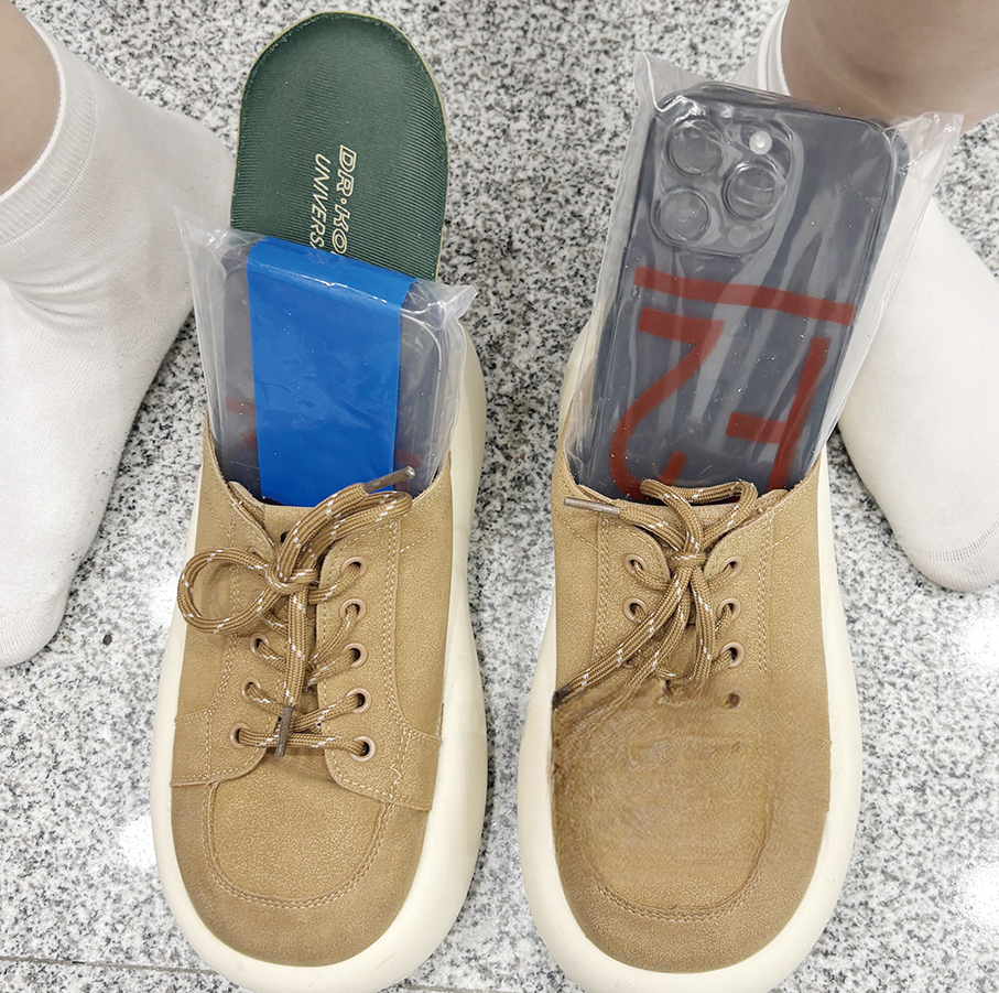 This undated handout provided by Zhuhai’s Gongbei Customs shows four used smartphones wrapped in plastic film hidden inside the smuggler’s shoes.