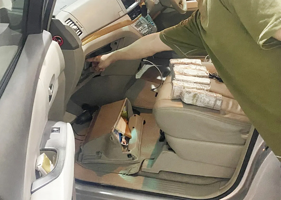 According to the statement, on October 1, Gongbei Customs officers at the Gongbei Border checkpoint while inspecting a dual–plate vehicle noticed anomalies and signs of modification in the glove compartment of the front passenger seat.