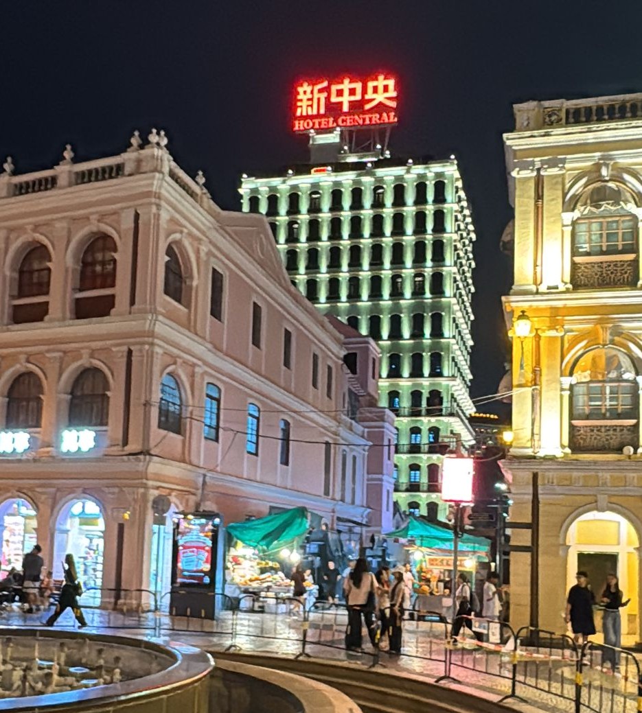 Caption: Pedestrians walk along Macau's main square, Largo do Senado, near Hotel Central, in the city centre this evening. - Photo: Carl Leong