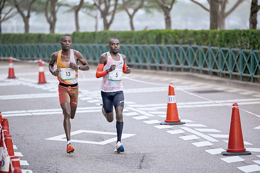 This handout photo provided by the Sports Bureau (ID) on Sunday shows Victor Kipchirchir (left), the men’s winner of the 2025 Galaxy Entertainment Macao International Marathon on the way to his victory that day. The statement released by the organisers did not identify the other runner shown in the photo.