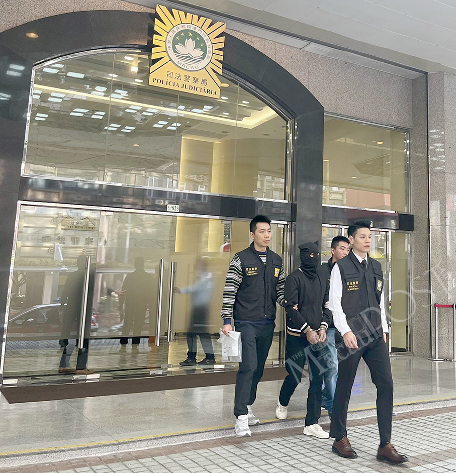 Judiciary Police (PJ) officers escort the hooded robbery suspect in the first case to a PJ van outside the PJ headquarters in Zape on Sunday. – Photo: Maria Cheang Ut Meng