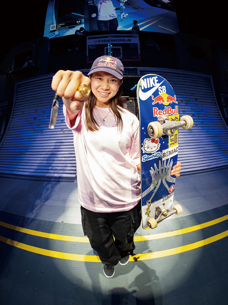 This photo provided by Melco Resorts & Entertainment on Tuesday shows FISE: Battle of the Champions 2026 women’s pro final champion Yumeka Oda posing with her skateboard and award in Cotai.