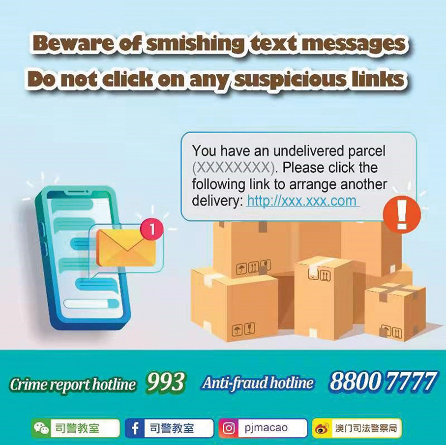 The Judiciary Police (PJ) announced in a statement yesterday that they were informed by the public of SMS messages from fake courier companies asking for additional fee payments for unsuccessful parcel deliveries.