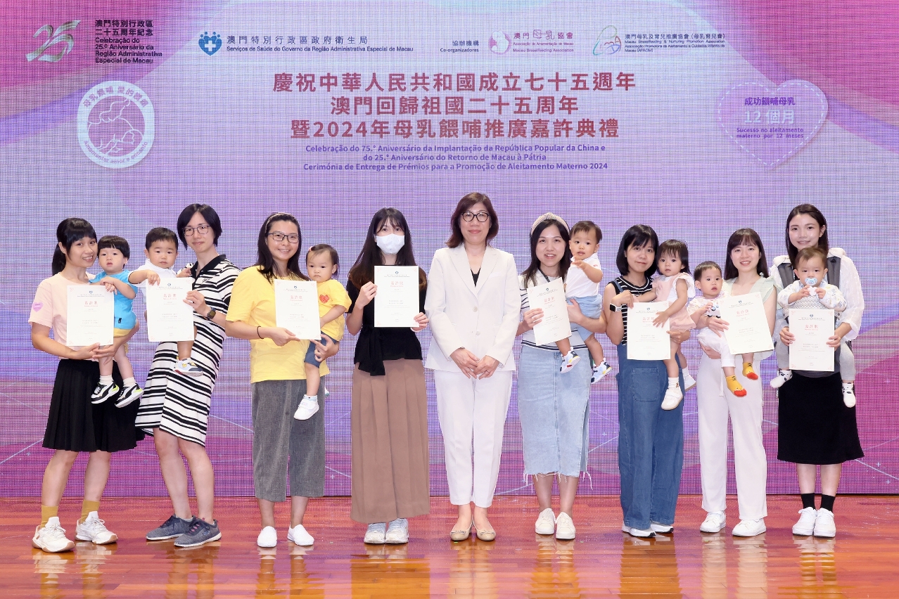 This handout photo provided by the Health Bureau (SSM) yesterday shows eight breastfeeding mothers and their kids who have been breastfeeding for 12 to 24 months, awarded certificates by SSM Acting Deputy Director Loi I Leng (centre) during the bureau’s 2024 Breastfeeding Promotion Recognition Ceremony on Saturday.