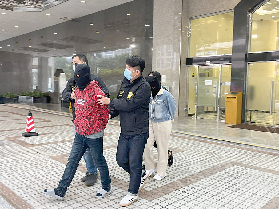 The two hooded drug suspects from Indonesia are escorted by Judiciary Police (PJ) officers from the PJ headquarters in Zape to a vehicle after yesterday’s press conference. – Photo: Maria Cheang Ut Meng