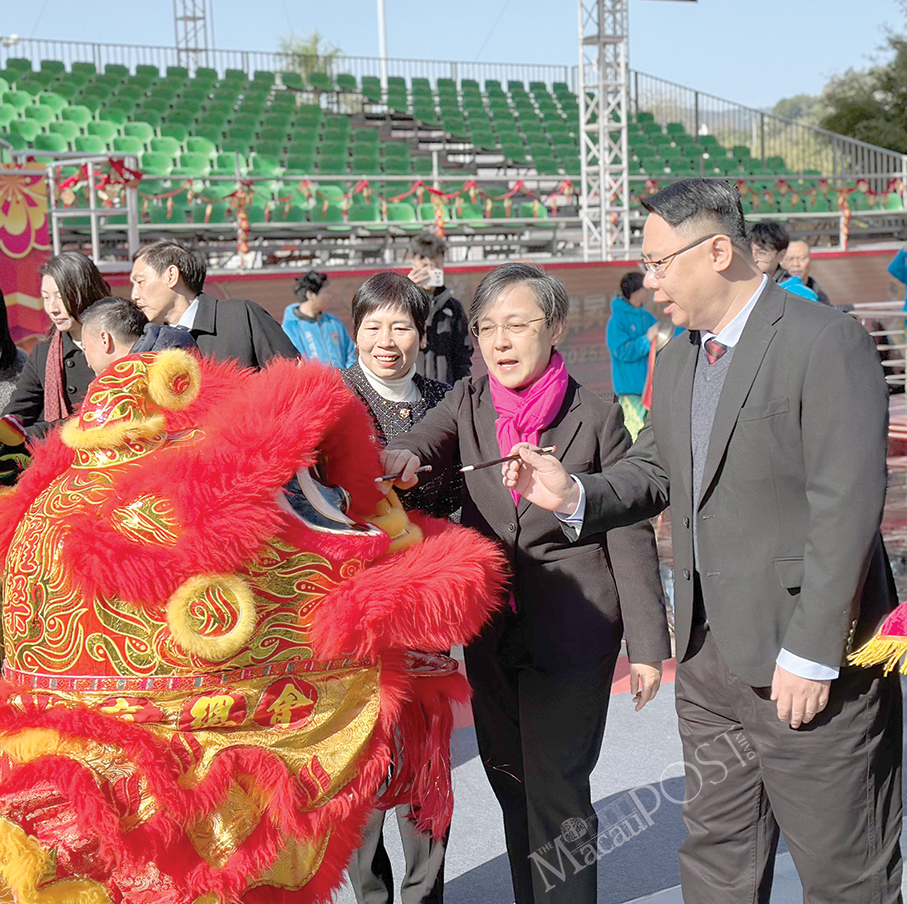 Macau Government Tourism Office (MGTO) Director Maria Helena de Senna Fernandes (centre) dots a lion’s eyes during yesterday’s traditional blessing ceremony at Sai Van Lake Square. – Photos: Yuki Lei