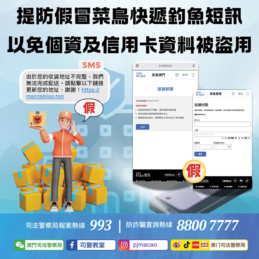 This poster provided by the Judiciary Police (PJ) on Friday warns members of the public of the logistics company “Cai Niao SMS scam”.