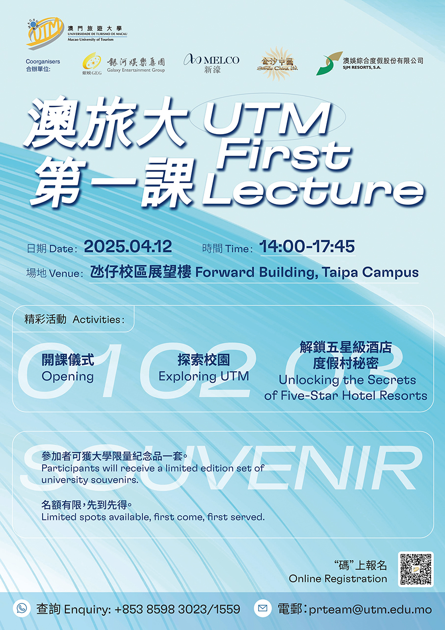 This poster provided by the Macao University of Tourism (UTM) promotes the “UTM First Lecture”, which will take place next Saturday.