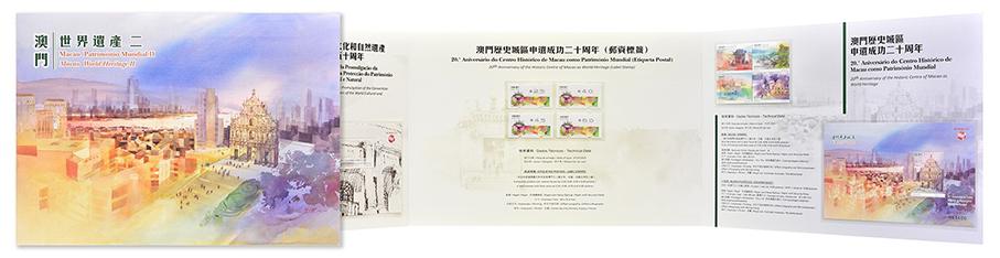 The pack features the 2022 issue of the “50th Anniversary of the Promulgation of the Convention Concerning the Protection of the World Cultural and Natural Heritage”, “20th Anniversary of the Historic Centre of Macao as World Heritage (Label Stamp)” and “20th Anniversary of the Historic Centre of Macao as World Heritage” issued this year.