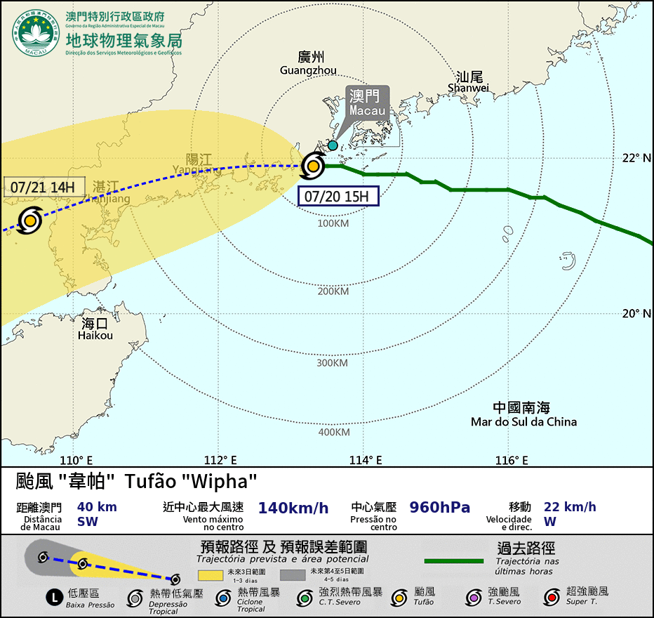 As of 3 p.m., Typhoon "Wipha" was estimated to be about 40 km southwest of Macau, the bureau said, adding that the typhoon was forecast to move West at around 22km/h.
