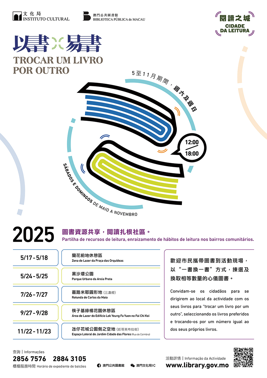The Cultural Affairs Bureau (IC) will hold its regular “Book for Book” swap event this weekend at Rotunda de Carlos da Maia (commonly known as “Three Lamps”), inviting the public to exchange used books and aiming to promote reading habits in the community through a convenient and accessible platform, according to an IC statement on Tuesday.