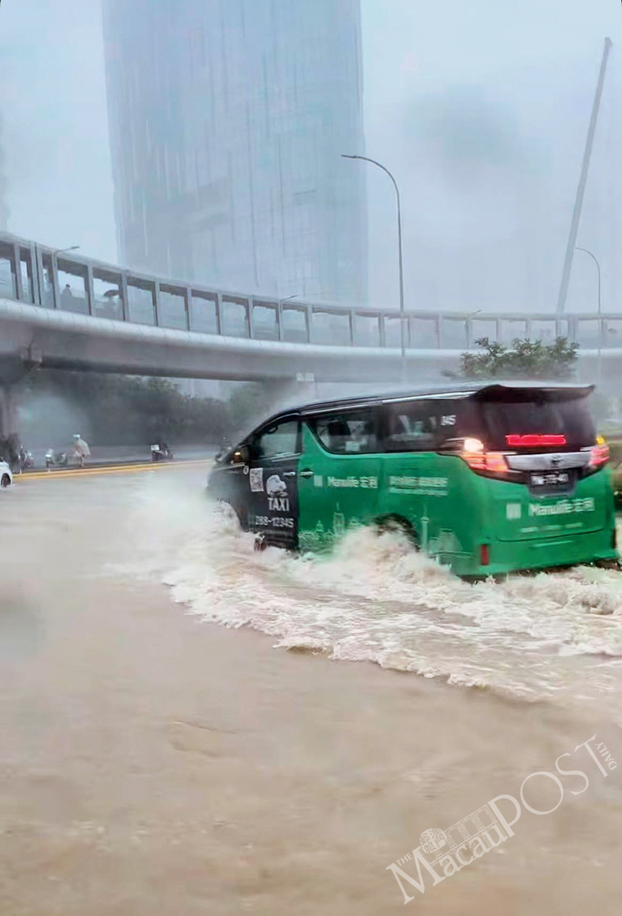 A taxi braves severe flooding on the Cotai roundabout during yesterday afternoon’s “Black Rainstorm” warning. – Photo: MPDG