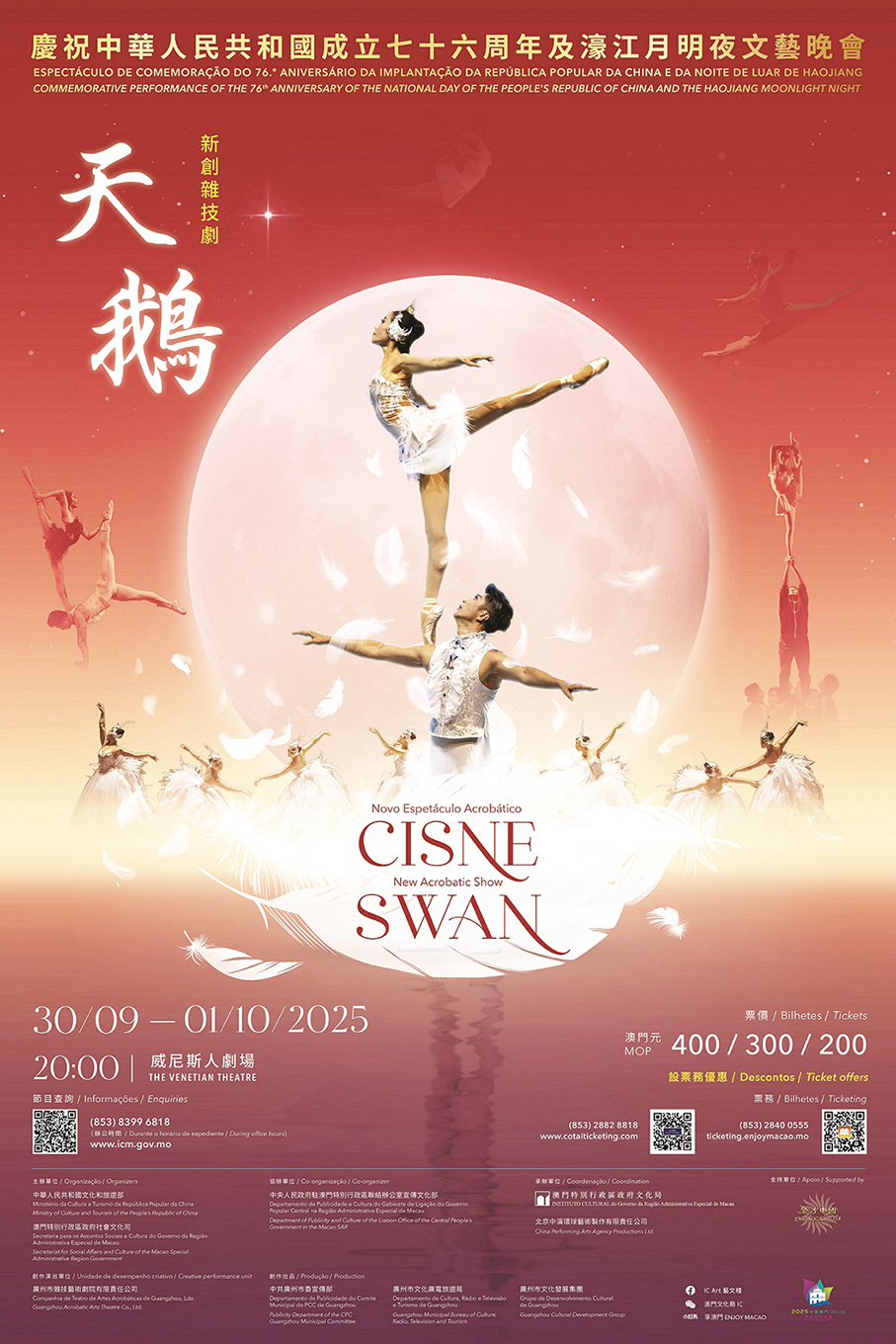 The Cultural Affairs Bureau (IC) announced in a statement earlier this week that it will celebrate National Day and the Mid-Autumn Festival (colloquially also known as “Mooncake Festival”) by staging an event titled “Commemorative Performance of the 76th Anniversary of the National Day of the People’s Republic of China and the Haojiang Moonlight Night – New Acrobatic Show ‘Swan’” on September 30 and October 1 starting at 8 p.m. at The Venetian Theatre in Cotai. Ticket sales started yesterday.