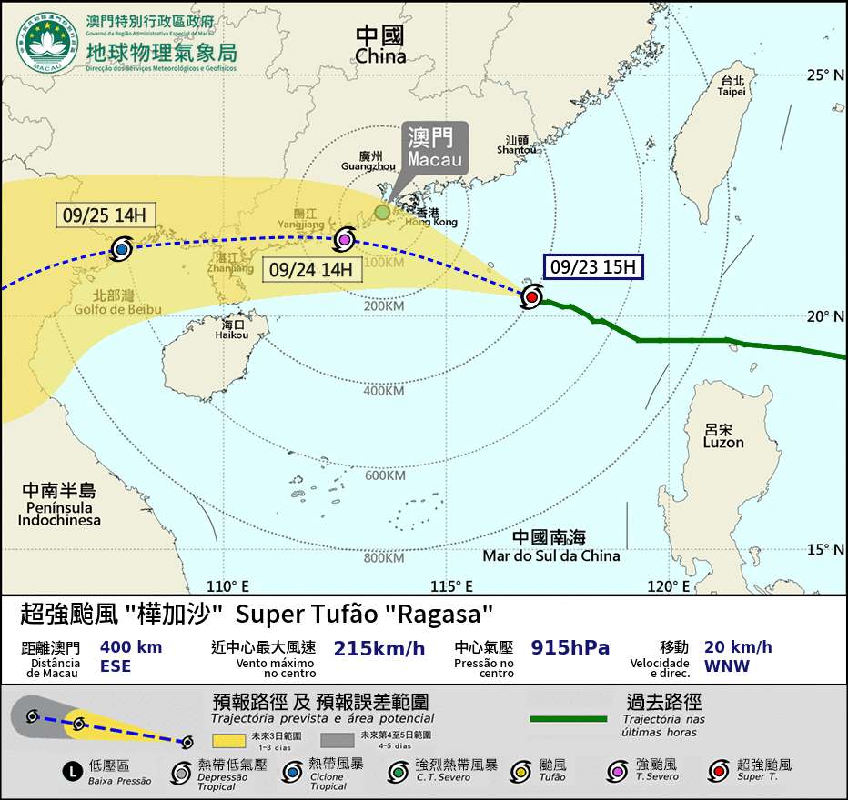 “Based on the current forecast track, ‘Ragasa’ will continue moving in a west-northwest direction over the next two days, gradually approaching Macau. Winds will begin to strengthen significantly, with showers and thunderstorms later today, and the Tropical Cyclone Signal No. 8 will be issued at 17:00 [5 p.m.],” the statement said.