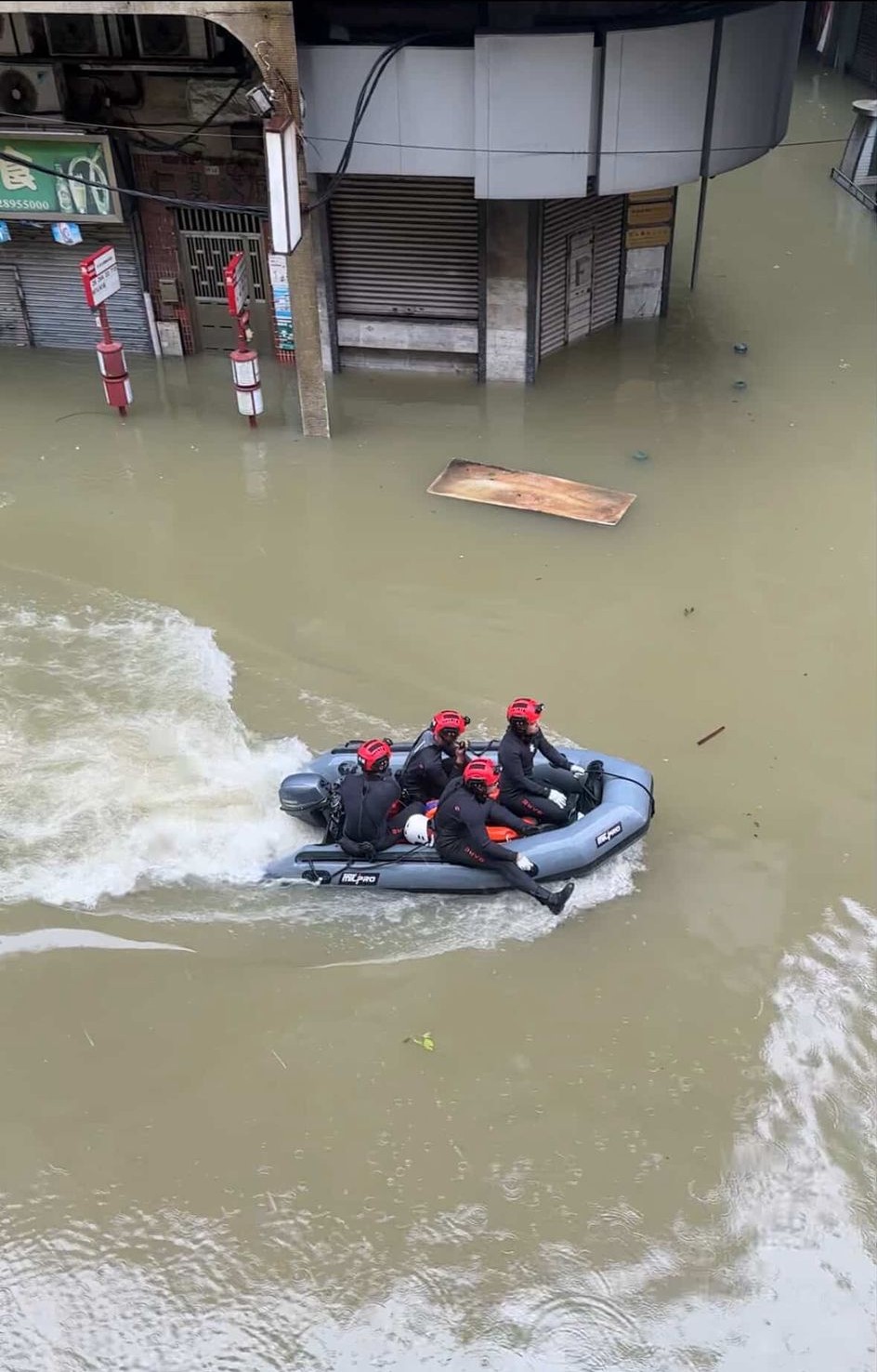 Civil Protection Operations Centre staff patrol a flooded area in Macau this morning. - Photo: MPDG