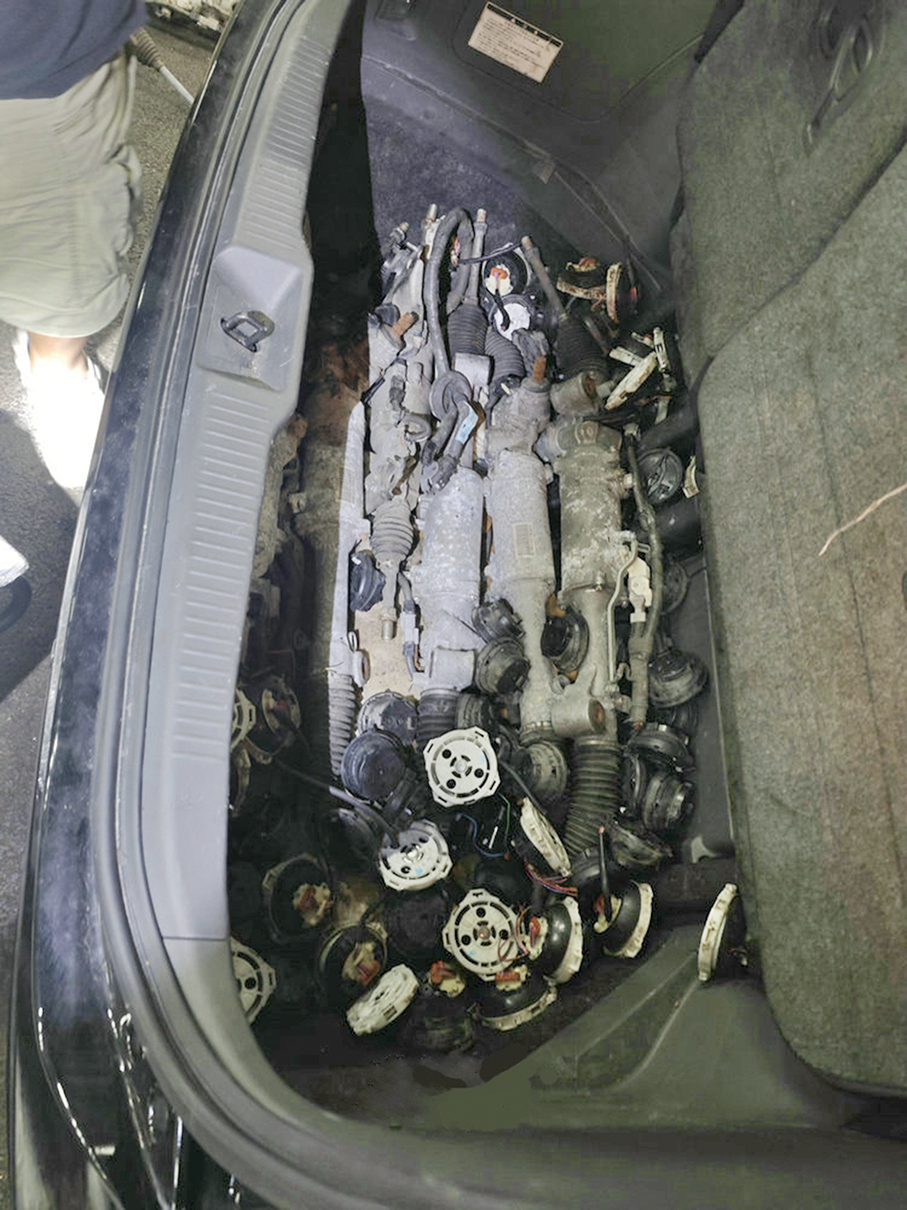 This undated photo provided by Zhuhai’s Gongbei Customs shows used auto parts hidden in the boot of the smuggler’s car.