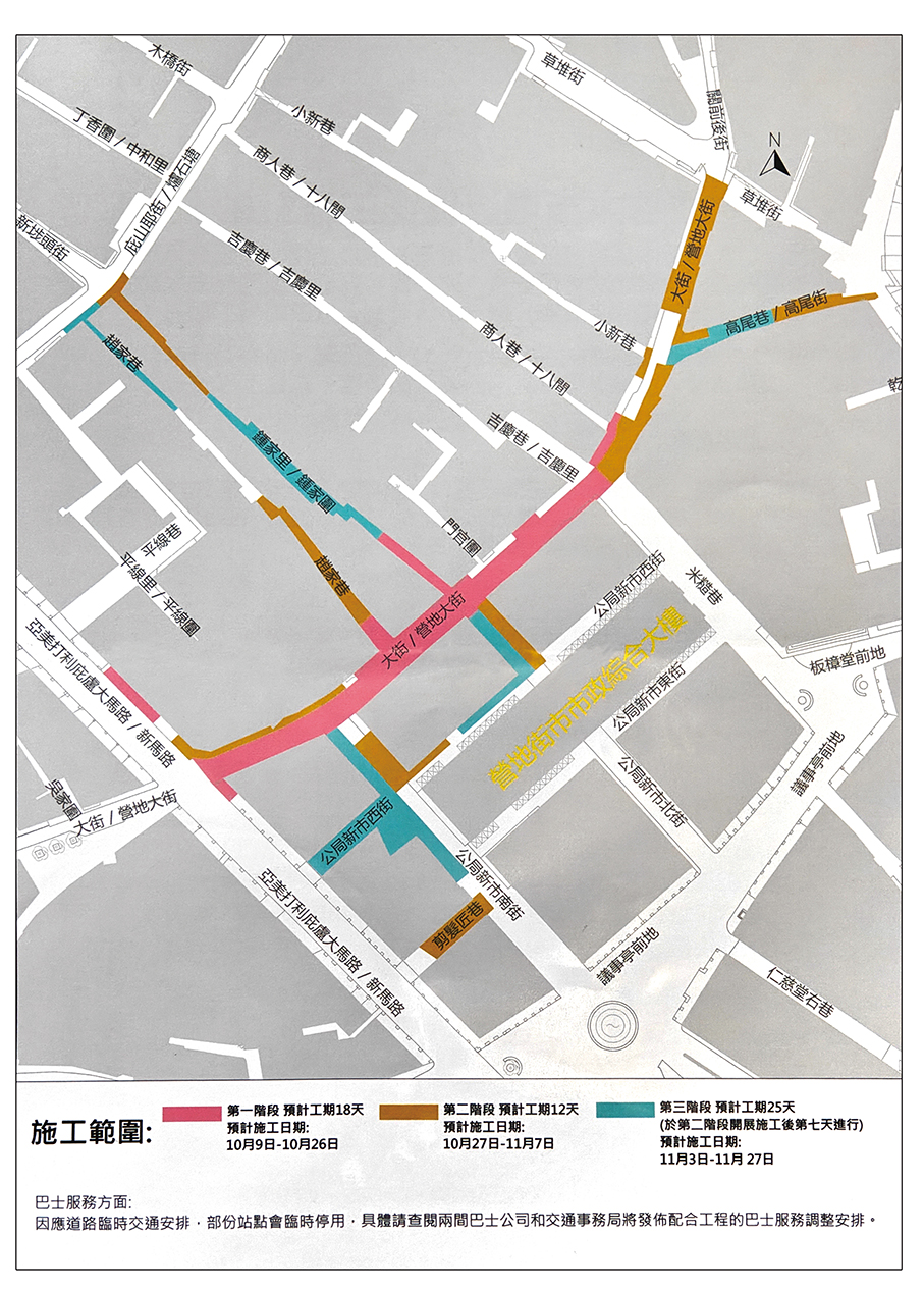 During the third phase, Mak said, from November 8 to November 27, construction work will be concentrated on the internal streets within the district. The temporary vehicular traffic closures and reversed traffic directions in Rua dos Mercadores, Rua das Estalagens and Rua de Camilo Pessanha will be lifted at the conclusion of the third phase, with the original traffic arrangements resuming from 10 a.m. on November 8.