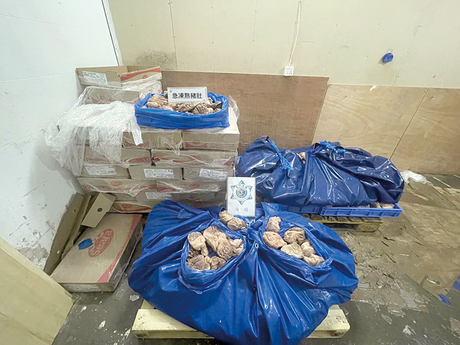 Macau Customs Service officers raided a parallel-trading den in the peninsula’s northern district on Wednesday where they seized 650 kilogrammes of frozen cooked pork tripe worth around 65,000 patacas in total.