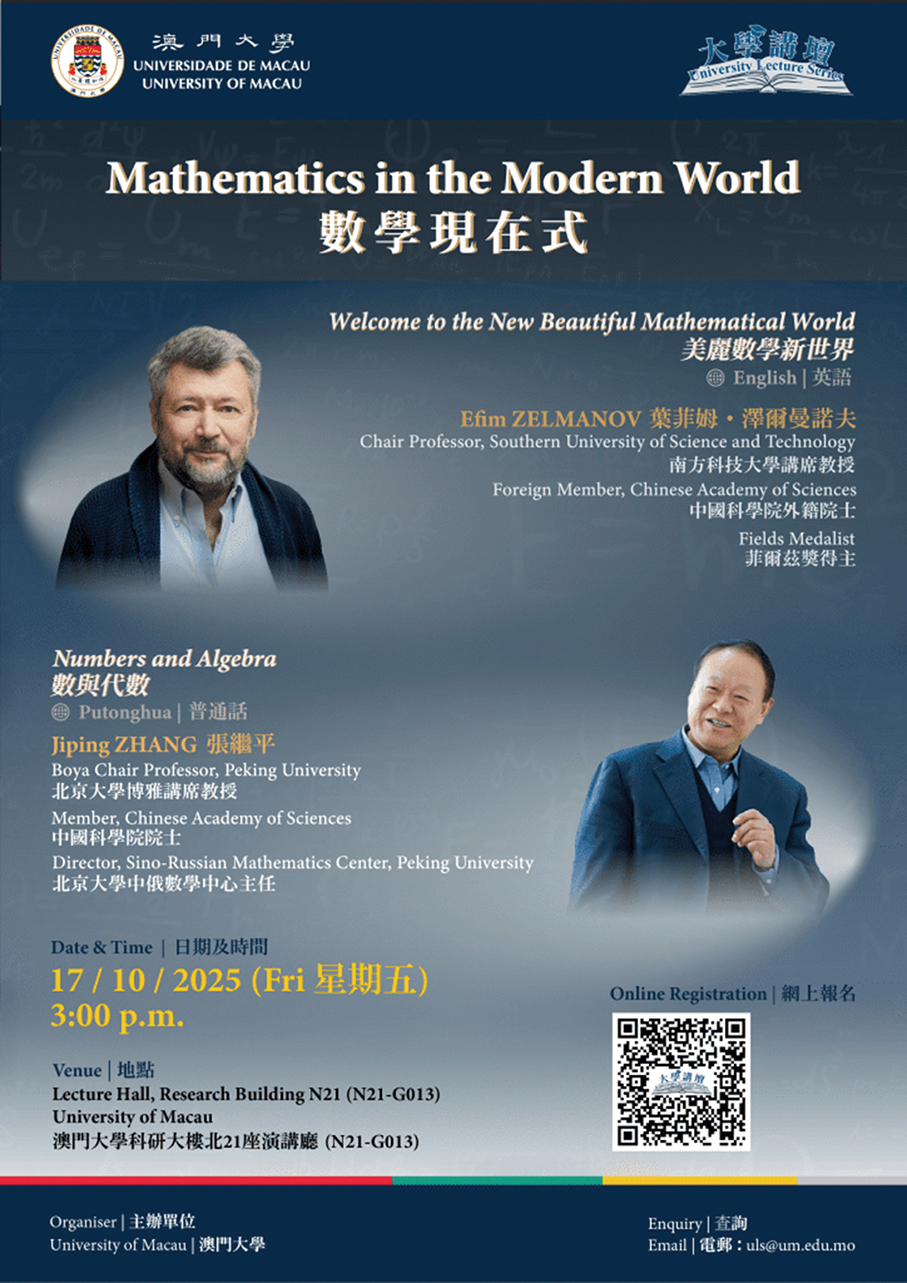 This poster provided by the University of Macau (UM) on Tuesday promotes “Mathematics in the Modern World”, slated to be held tomorrow at the Lecture Hall of the UM Research Building N21 (N21-G013), featuring Efim Zelmanov, chair professor at Shenzhen’s Southern University of Science and Technology (SUSTech), and Boya Chair Professor at Peking University Zhang Jiping.