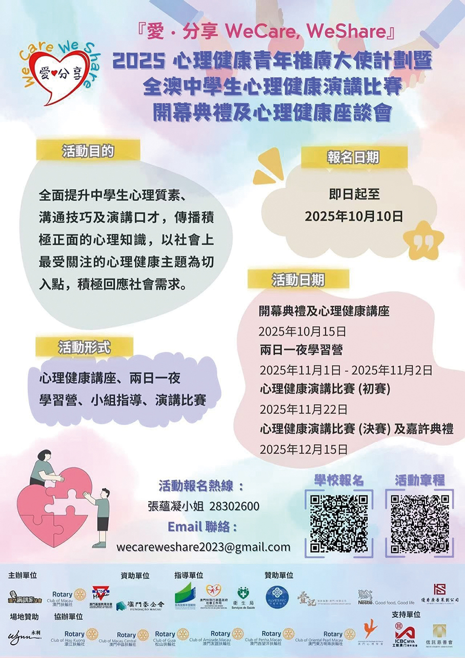 This photo downloaded yesterday from the Rotary Club of Macau’s Facebook page promotes the 2025 “We Care, We Share” Mental Health Youth Ambassador Programme and Macao Secondary School Mental Health Public Speaking Contest, which will take place until the end of the year.