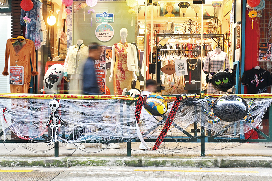A man and a child pass a shop with Halloween decorations near Albergue SCM yesterday afternoon. – Photo: Rui Pastorin