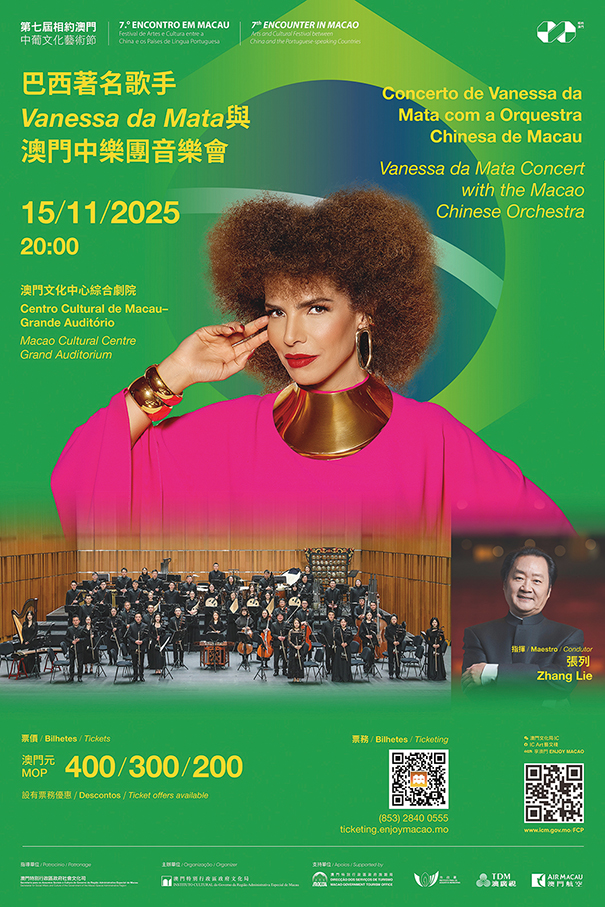This poster recently provided by the Cultural Affairs Bureau (IC) promotes the “Vanessa da Mata Concert with the Macao Chinese Orchestra” event set to be held on November 15 at the Macau Cultural Centre’s (CCM) Grand Auditorium.