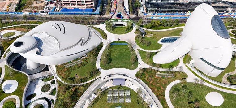 Caption: This drone photo taken yesterday shows the Shenzhen Bay Culture Square in Shenzhen City, Guangdong Province. The Shenzhen Bay Culture Square began trial operation yesterday. The landmark square, with a construction area of 188,000 square meters, has nine exhibition halls.- Xinhua