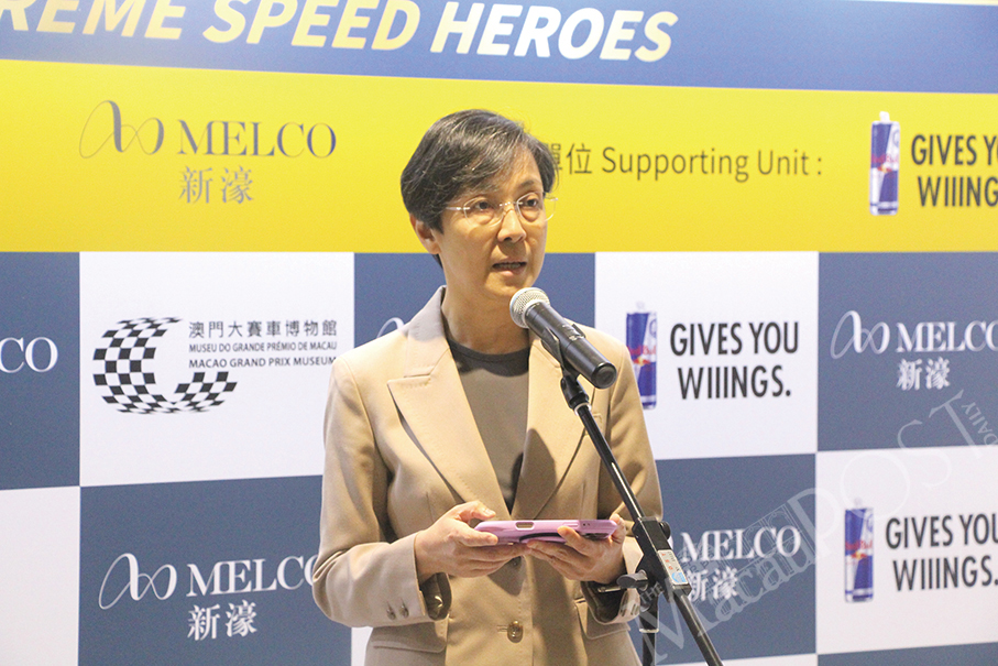 Macau Government Tourism Office (MGTO) Director Maria Helena de Senna Fernandes delivers her opening remarks during yesterday’s “Extreme Speed Heroes” opening ceremony at the Macau Grand Prix Museum (MGPM) in Zape.