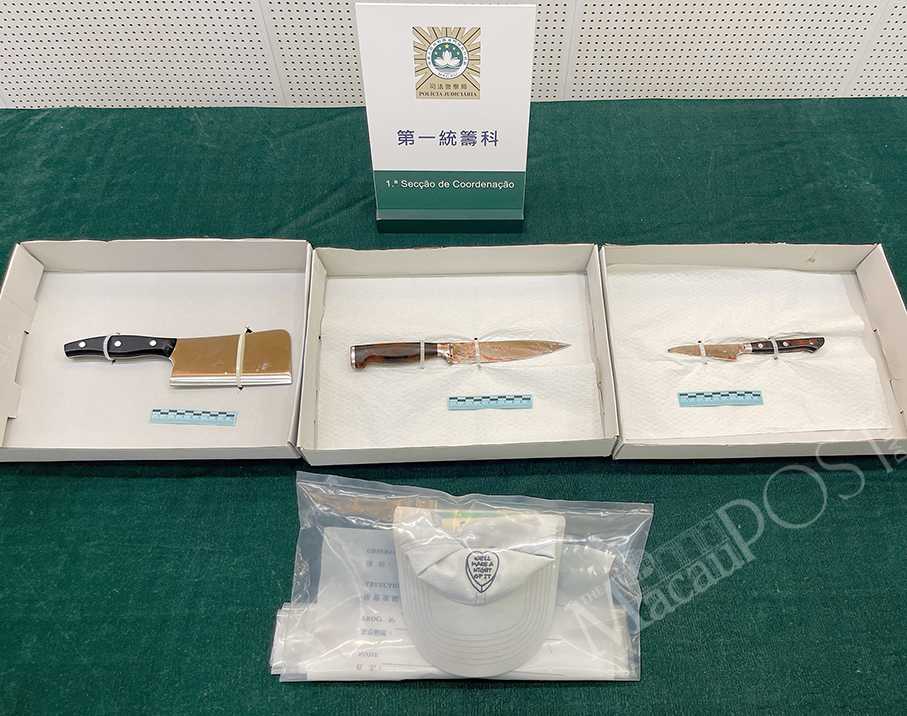 Two bloodstained knives seized from the murder scene and a cleaver seized from the suspect’s backpack are displayed during a special press conference on Saturday about Thursday’s homicide by stabbing of a woman by her female friend in a hotel guestroom in Cotai. – Photo: Armindo Neves
