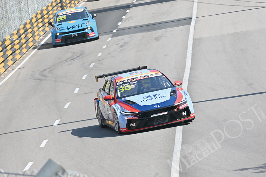 Australia’s Josh Buchan from HMO Customer Racing (Hyundai Elantra N TCR) drives ahead of Lynk & Co Cyan Racing’s (Lynk & Co 03 FL TCR) Ma Qinghua from the Chinese mainland yesterday. – Photos: Rui Pastorin