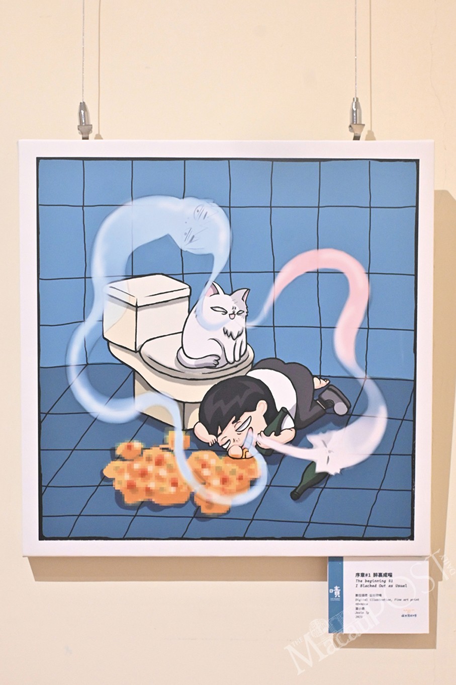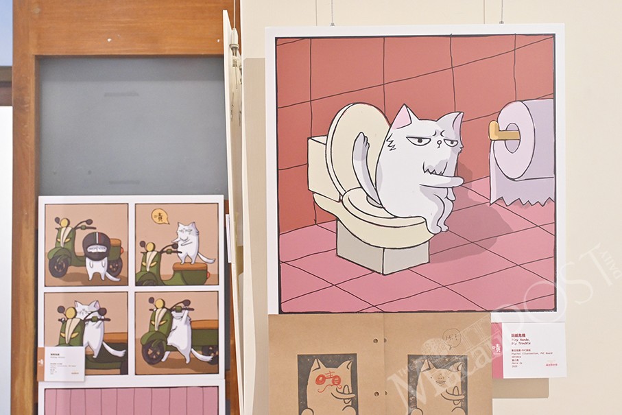 Showcased in an illustration exhibition titled “Swapped: My Brother’s Life as a Cat” that kicked off last week, it features a series of 35 colourful digital drawings presented at 10 Fantasia Gallery’s Room C03. Upon entering, exhibitiongoers will be introduced to the characters involved in the works, namely three siblings and the family cat, as well as the situations that they find themselves in before and after the swap occurred. Ip reimagines and draws moments from commuting and scenes of working in an office to glimpses of life and interactions between the characters as they go about their days.