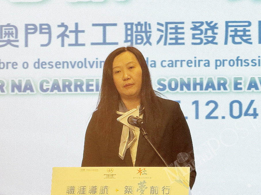 Macau Federation of Social Workers Chairperson Cheong Un Si addresses yesterday’s one-day “Charting Career Paths, Pursuing Dreams” social worker career development roundtable conference at Macau Fisherman’s Wharf in Nape.