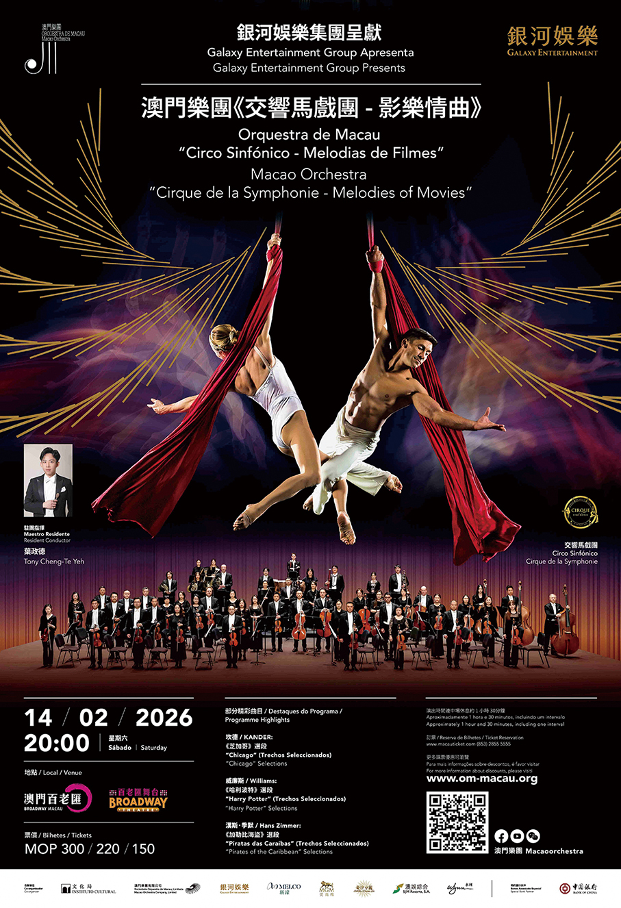 The Macao Orchestra 2025-26 concert season is co-organised by the Cultural Affairs Bureau (IC), Macao Orchestra, and Macau’s six integrated resort operators, with support from the Bank of China Macau (BOC) Branch.