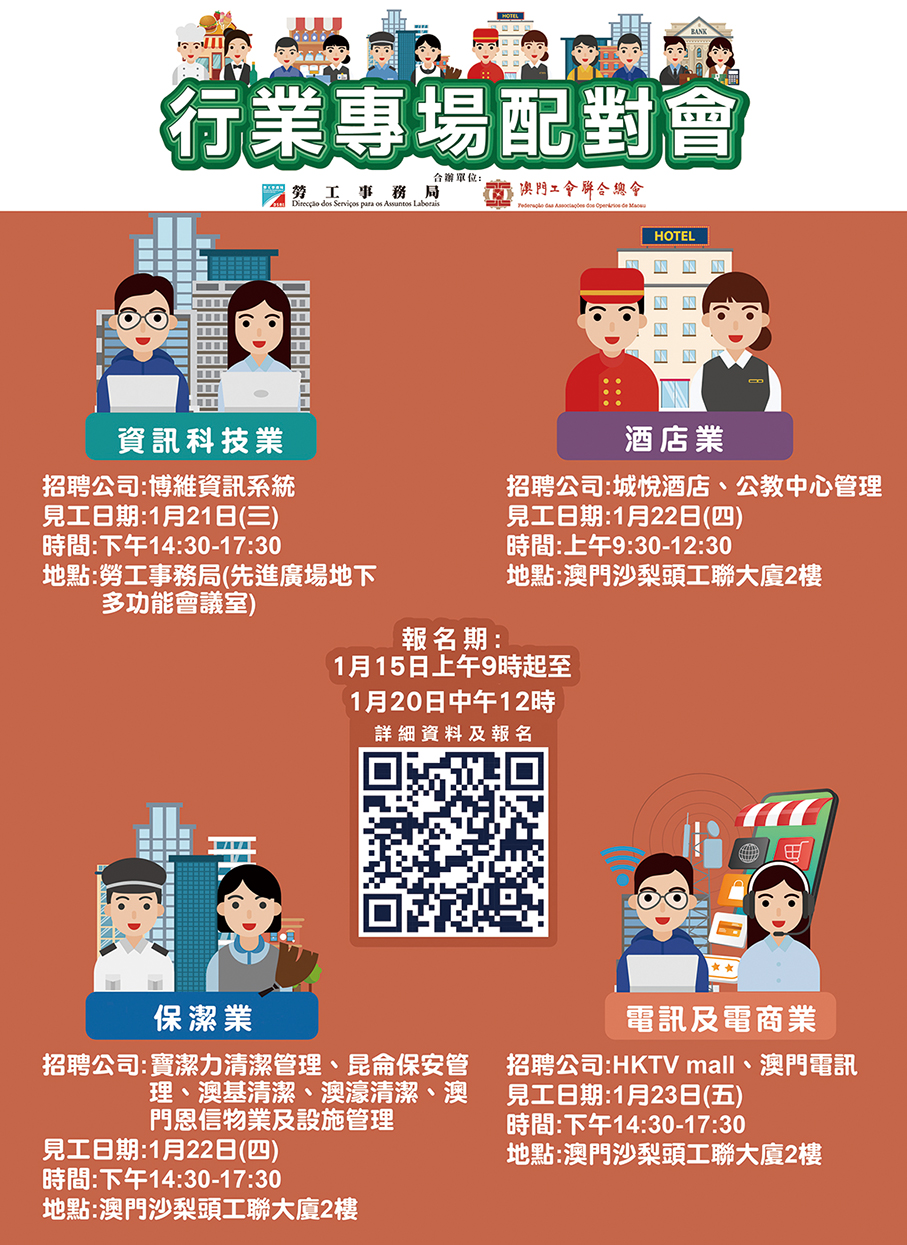 In the morning of January 22, a job matching session for the hotel sector will be held, with “City Viva Hotel (Macau) Limited” and “Catholic Centre Management Company” participating, the statement noted, adding that a total of 51 vacancies will be available, including customer service manager, housekeeping supervisor, security supervisor, engineering technician, and front desk staff.