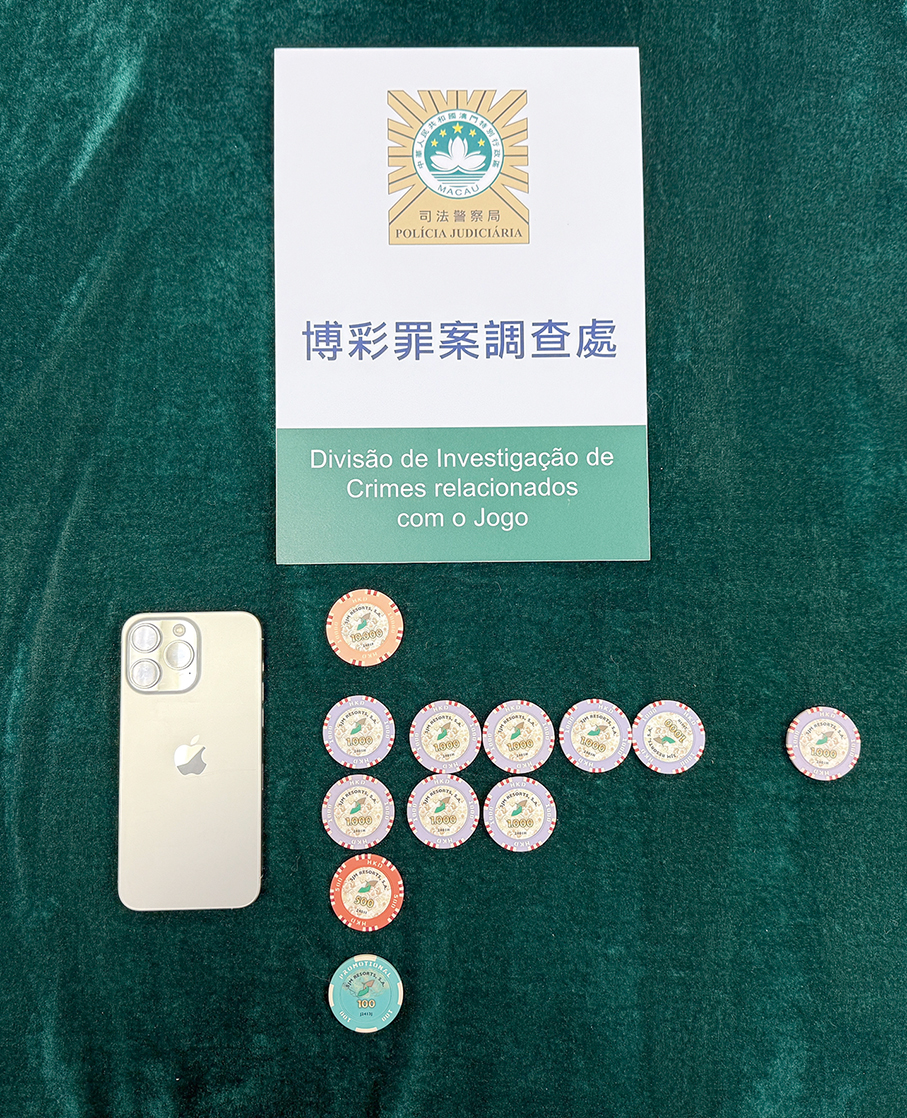 This undated handout photo provided by the Judiciary Police (PJ) yesterday shows a smartphone and HK$18,600 in chips seized from the illegal currency exchange suspect, along with HK$1,000 in chips confiscated from his client.