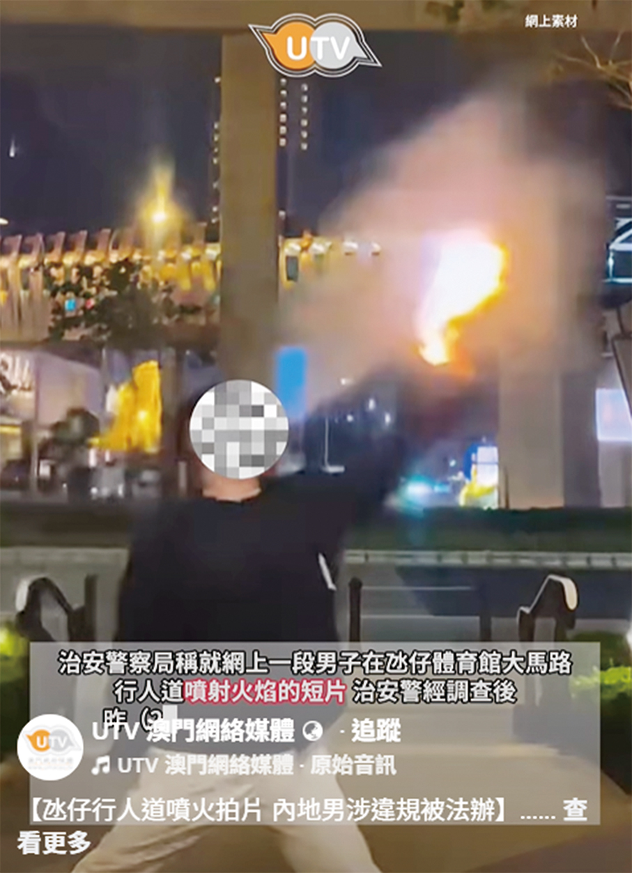 This video clip, circulating on social media, uploaded by local Chinese-language online media UTV on its official Facebook account yesterday shows the man spouting flames on Avenida da Nave Desportiva in Cotai on Tuesday last week.