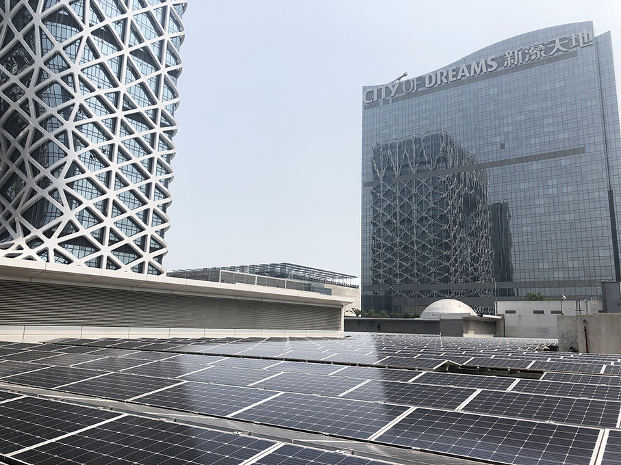 This undated handout photo provided by integrated resort operator Melco Resorts & Entertainment on Thursday shows solar panels at City of Dreams (COD) resort in Cotai.