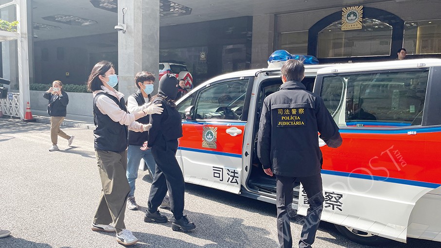 Judiciary Police (PJ) officers escort the three hooded illegal currency exchange suspects to PJ vans outside the PJ headquarters in Zape yesterday. – Photos: Armindo Neves