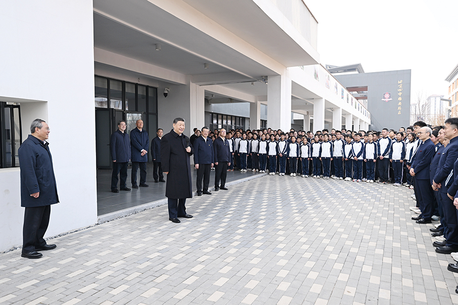 President Xi Jinping (center), also general secretary of the Communist Party of China Central Committee and chairman of the Central Military Commission, visits the Xiong’an campus of Beijing No. 4 High School in the Xiong’an New Area, Hebei Province, yesterday. Xi inspected the Xiong’an New Area on Monday, when he also chaired a symposium on further advancing the high-quality construction and development of the area. – Xinhua