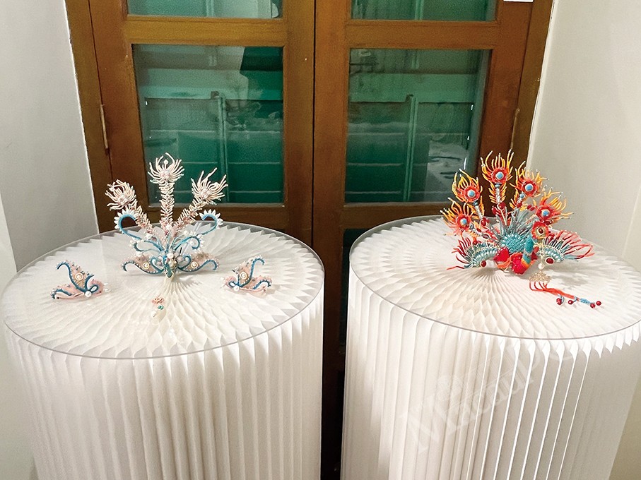 Diǎn cuì (點翠), a style of Chinese art featuring kingfisher feathers; bead weaving; róng huā* (絨花); and wrapped flower techniques, meanwhile, are taking centre stage in Tung’s works at room B. The showcase aims to have the four techniques coexist with contemporary daily life, creating usable and wearable objects, according to a statement from the gallery about her section.