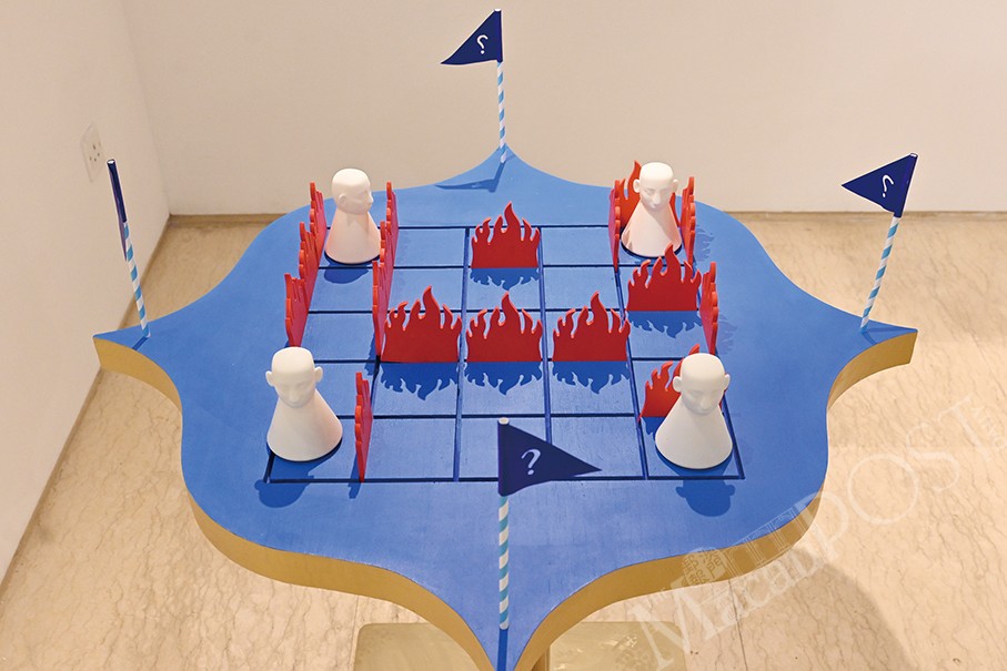 The other exhibits then followed suit, resulting in a mix of the entirely imaginative and the textually based. Among the artworks that Hio introduced yesterday are the installations “Protagonist in Blue” and “Reflect Me Gently”, which will greet gallerygoers as they enter the venue. Hio noted that both are derived from Chinese folklore and tradition, looking at what people will encounter in the underworld after death, particularly the ideas of the “sea of agony” that one traverses and the “mirror of karma” where one reflects on past deeds while one was alive.