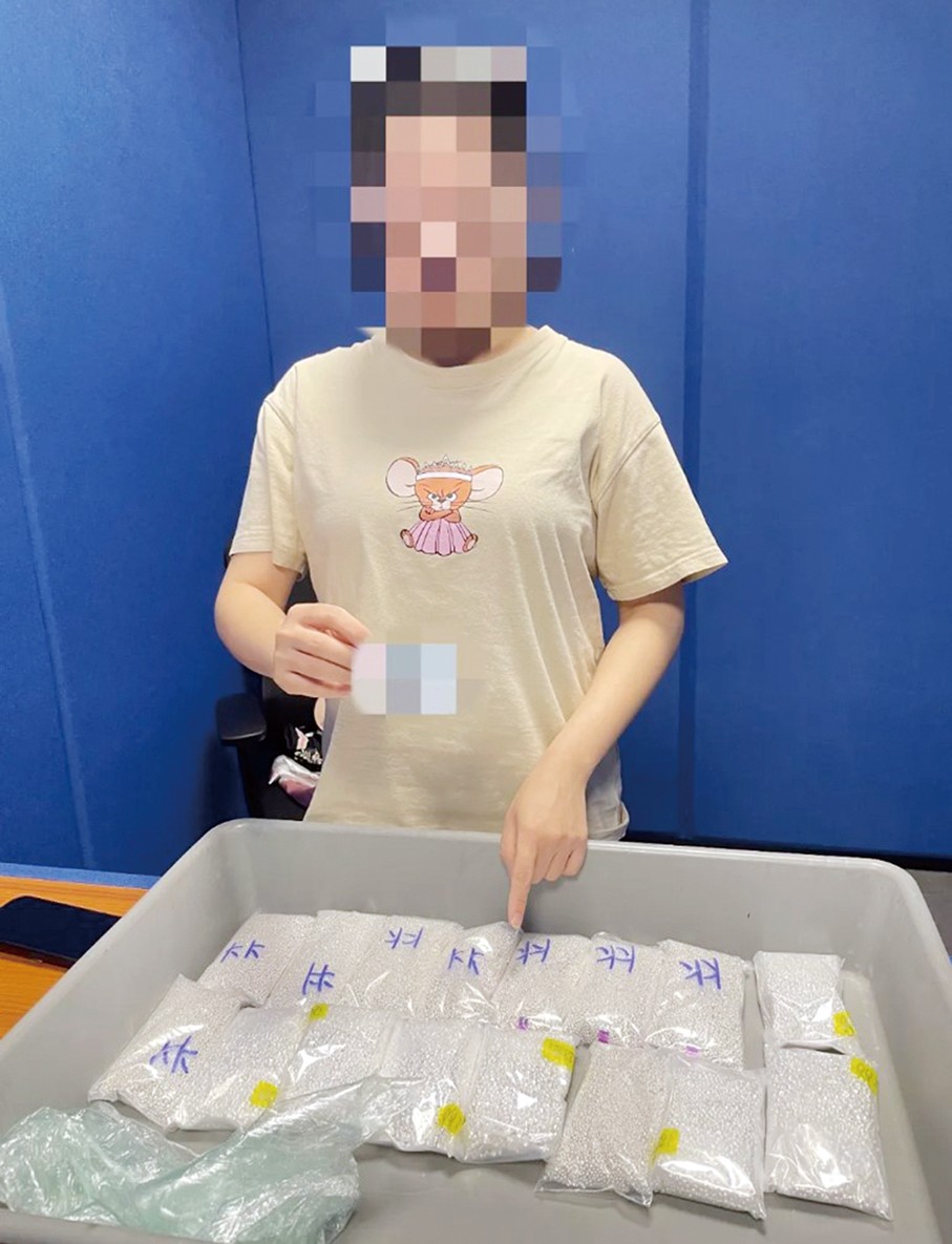 These two handout photos provided by Zhuhai’s Gongbei Customs on Wednesday shows 19.206 kilograms of silver granules seized from a female driver feigning to be pregnant, in arrivals of the Hengqin joint checkpoint on March 13.