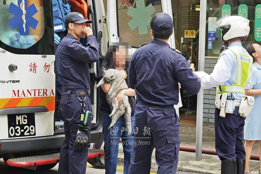 A woman carries a cat in front of a residential building on Avenida do Conselheiro Ferreira de Almeida after a fire probably caused by the “feline suspect” in the kitchen of a flat on the 20th floor on Saturday morning. – Photo courtesy of Macao Daily News.