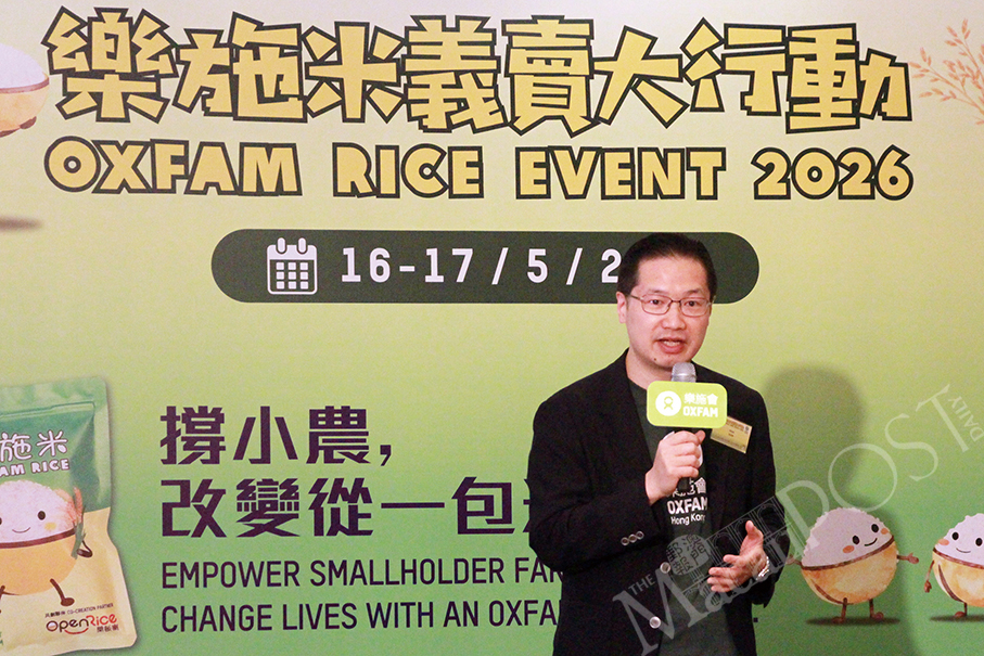 Tang said that Oxfam implements projects across the Chinese mainland, elsewhere in Asia and East Africa to help farmers adopt sustainable practices and strengthen resilience. Meanwhile, local Oxfam ambassador Terence Siufay (徐智勇) also attended the press conference, encouraging residents to support the campaign. Siufay, a Macau-born actor, singer and businessman, said each pack of Oxfam rice represents hope for farmers and called on the community to turn care into action.