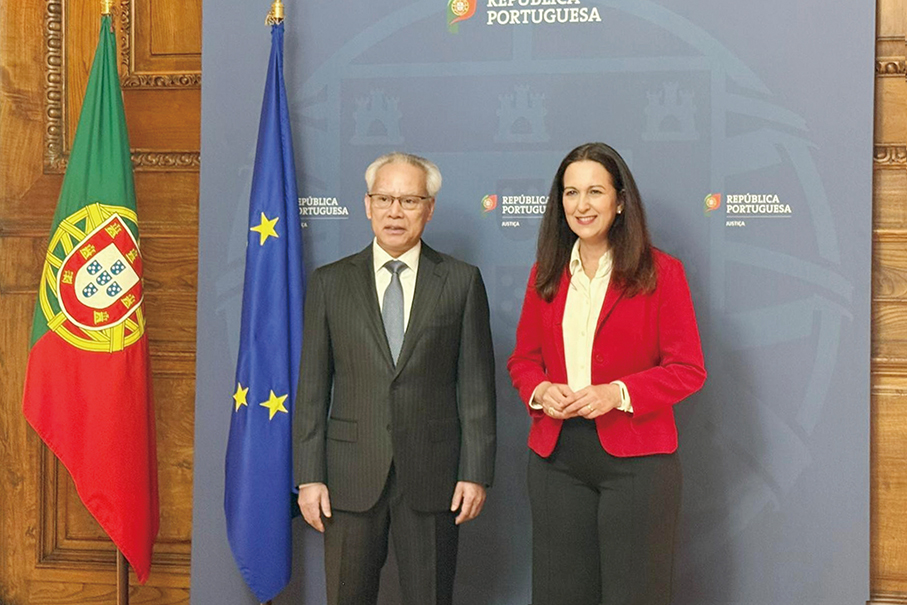 Macau Chief Executive Sam Hou Fai (left) and Portugal’s Minister of Justice Rita Júdice pose for a photo on the sidelines of their meeting in Lisbon yesterday morning (local time). – Photos courtesy of TDM