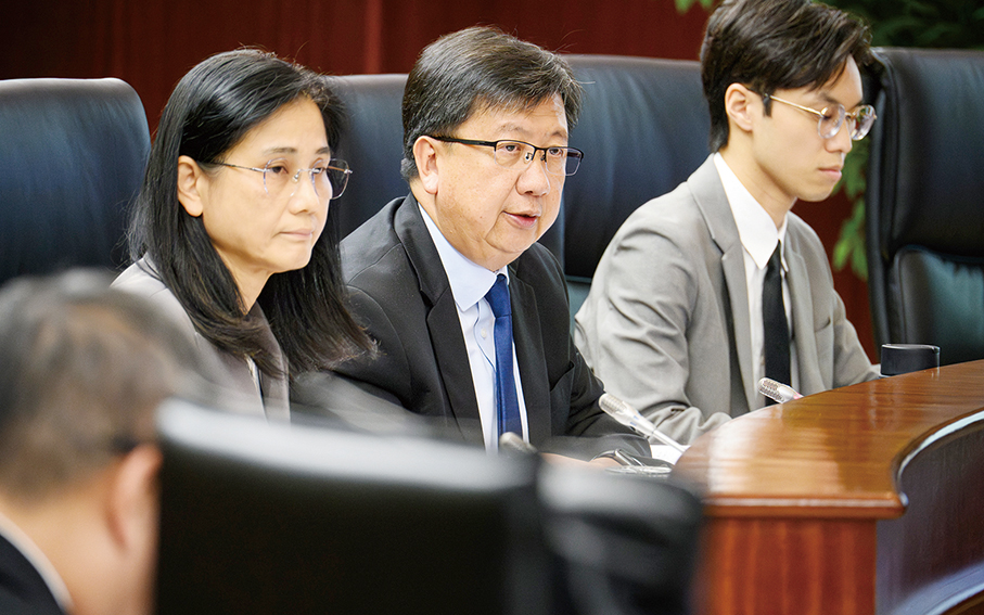 Flanked by officials including Marine and Water Bureau (DSAMA) Director Susana Wong Soi Man (left), Secretary for Transport and Public Works Raymond Tam Vai Man (centre) addresses yesterday’s plenary session in the Legislative Assembly’s (AL) hemicycle. – Photo: GCS