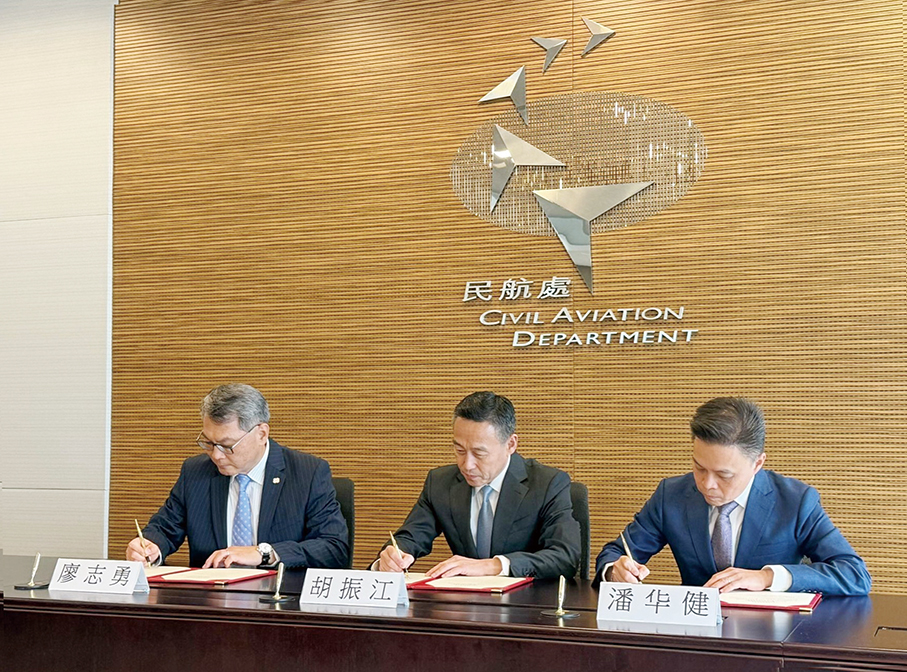 The Civil Aviation Administration of China (CAAC), Hong Kong’s Civil Aviation Department (HKCAD) and the Macau Civil Aviation Authority (AACM) signed four cooperation arrangements in Hong Kong yesterday, expanding mutual recognition of airworthiness standards and strengthening certification cooperation, including for the domestically developed and manufactured C929 aircraft, according to a statement by AACM yesterday.